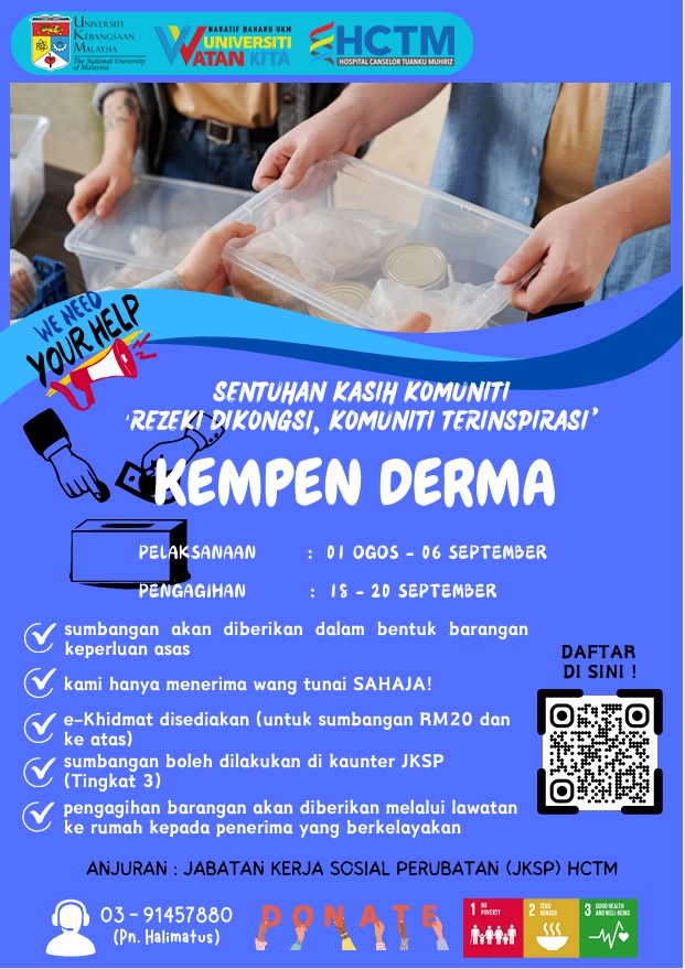 Assalamualaikum & Salam Sejahtera, Dimaklumkan bahawa pihak Jabatan Kerja Sosial Perubatan HCTM akan menganjurkan Program Infaq Ramadan TKPHCTM 1446H /...