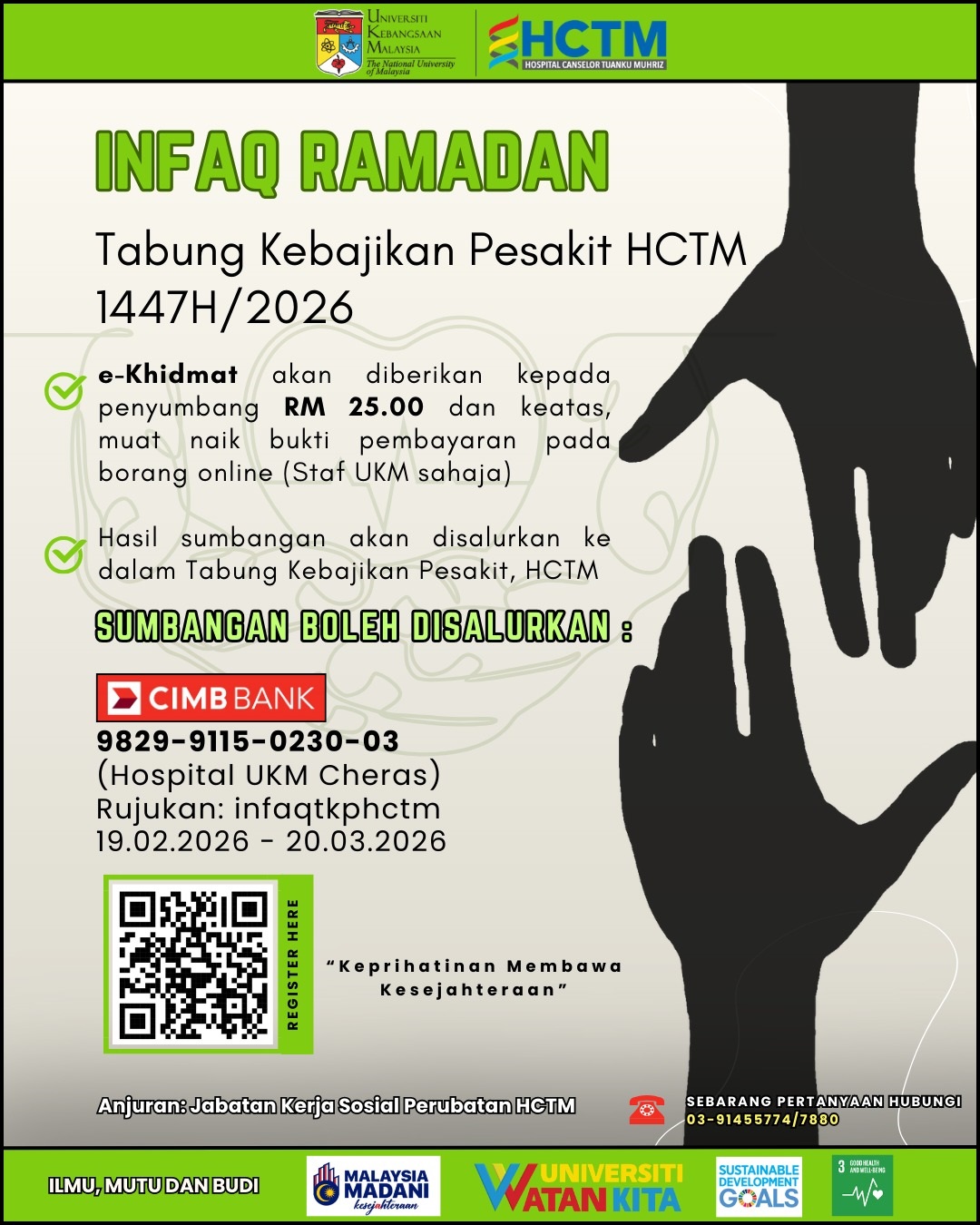 Dimaklumkan bahawa pihak Jabatan Kerja Sosial Perubatan HCTM akan menganjurkan Program Infaq Ramadan TKPHCTM 1447H / 2026 untuk Tabung Kebajikan Pesakit HCTM seperti butiran berikut: