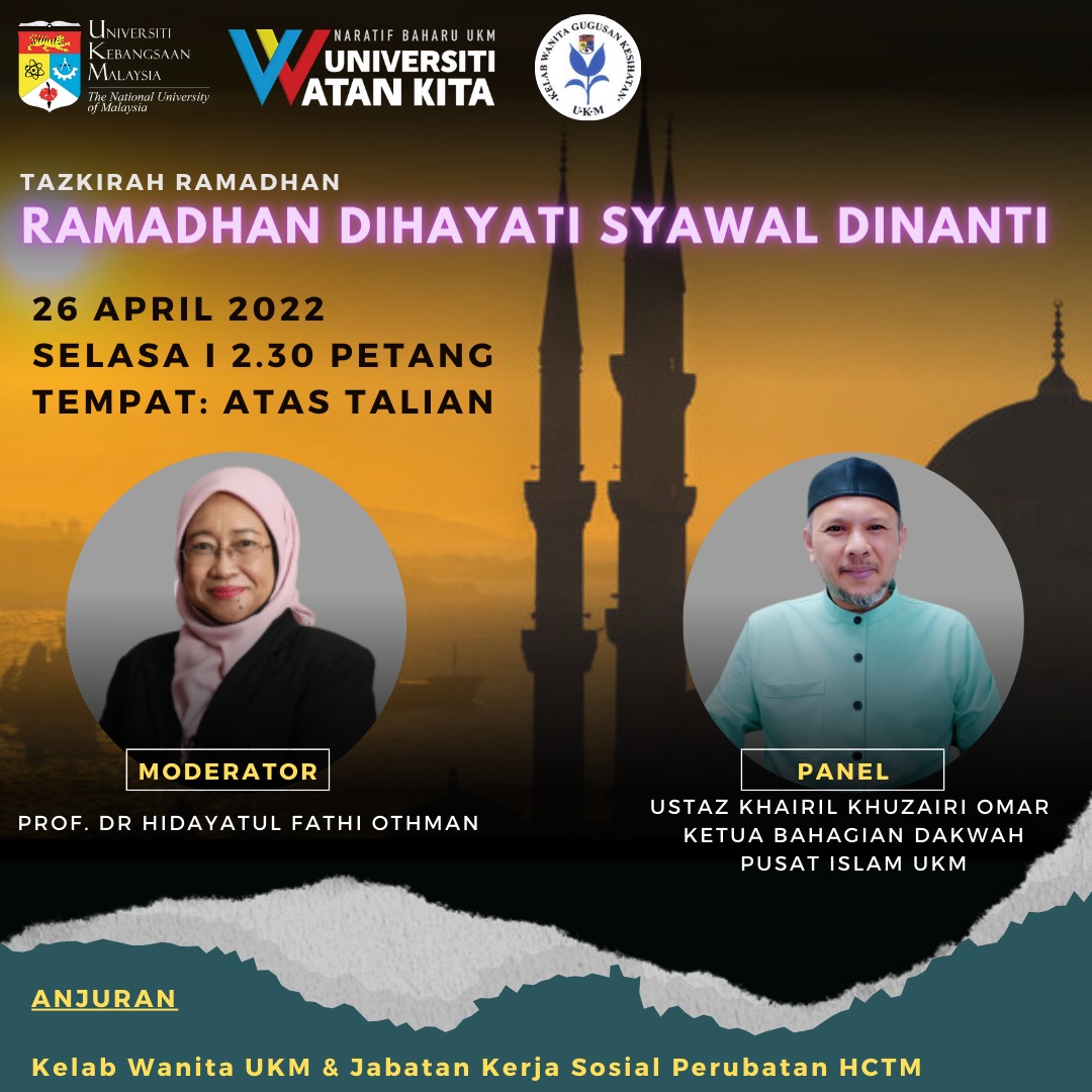 Sukacitanya dimaklumkan bahawa Kelab Wanita UKM dan Jabatan Kerja Sosial Perubatan, Hospital Canselor Tuanku Muhriz (HCTM) akan mengadakan program Tazkirah Ramadhan. Sehubungan dengan itu, semua warga UKM/HCTM dijemput hadir.