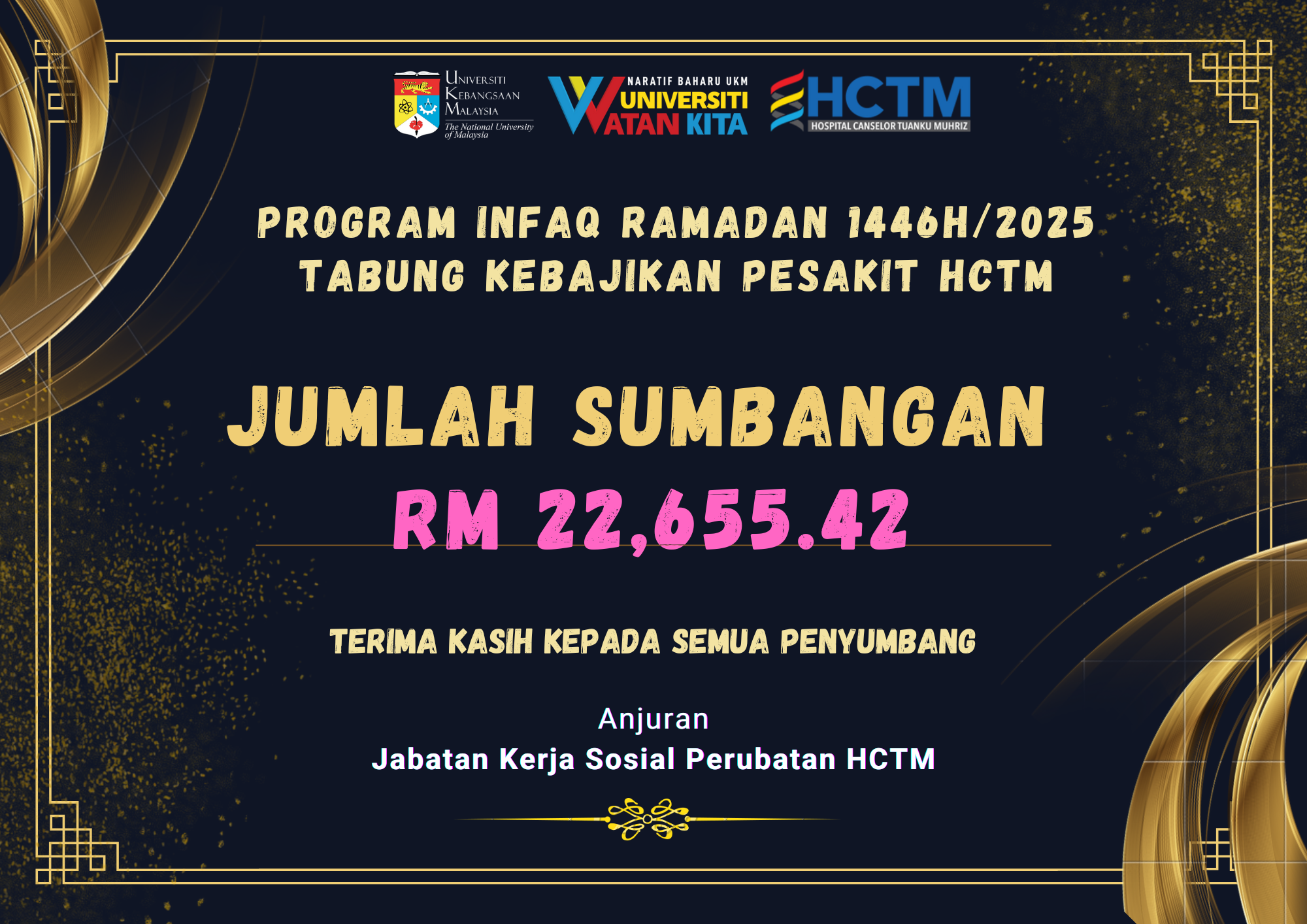 Jabatan Kerja Sosial Perubatan, Hospital Canselor Tuanku Muhriz mengucapkan terima kasih kepada semua penyumbang dan penderma atas sumbangan Program Infaq Ramadan TKPHCTM 1446H / 2025 anjuran Jabatan Kerja Sosial Perubatan HCTM untuk Tabung Kebajikan Pesakit HCTM. Sebagai makluman, dana terkumpul untuk program ini adalah sebanyak RM 22,655.42.00 dan kesemua sumbangan, terus disalurkan ke Tabung Kebajikan Pesakit HCTM untuk kegunaan pesakit-pesakit yang memerlukan.