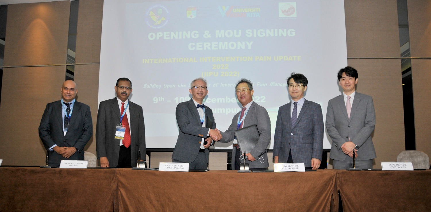 Majlis Perasmian Simposium Antarabangsa Intervensi Kesakitan Kronik 2022 dan Majis Menandatangani Memorandum Persefahaman (MoU) Antara Korean Pain Society dan Daradia The Pain Clinic, India telah diadakan pada 9 Disember 2022 di Connexion Hall, Level 3A, Nexus Bangsar South Kuala Lumpur. Simposium Antarabangsa Intervensi Kesakitan Kronik 2022 anjuran Jabatan Surgeri HCTM dengan kerjasama Persatuan Pengamal Perubatan Kesakitan Kronik (MSIPP) adalah wadah pakar-pakar bertauliah dalam bidang kesakitan kronik memberikan sesi ceramah tentang maklumat dan teknologi terkini dalam meningkatkan kemahiran memberi perawatan. Majlis telah dirasmikan oleh YBhg. Prof. Dato’ Dr. Hanafiah Harunarashid, Pro Naib Canselor (Kampus Kuala Lumpur) UKM.