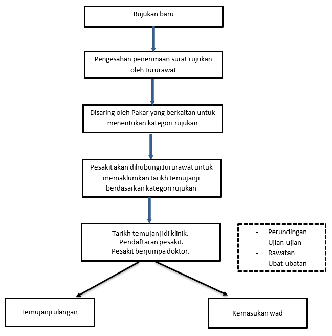 - Setiap kes baru akan diperiksa oleh Pakar bertugas atau Pegawai Perubatan dibawah pengawasan Pakar yang bertugas.