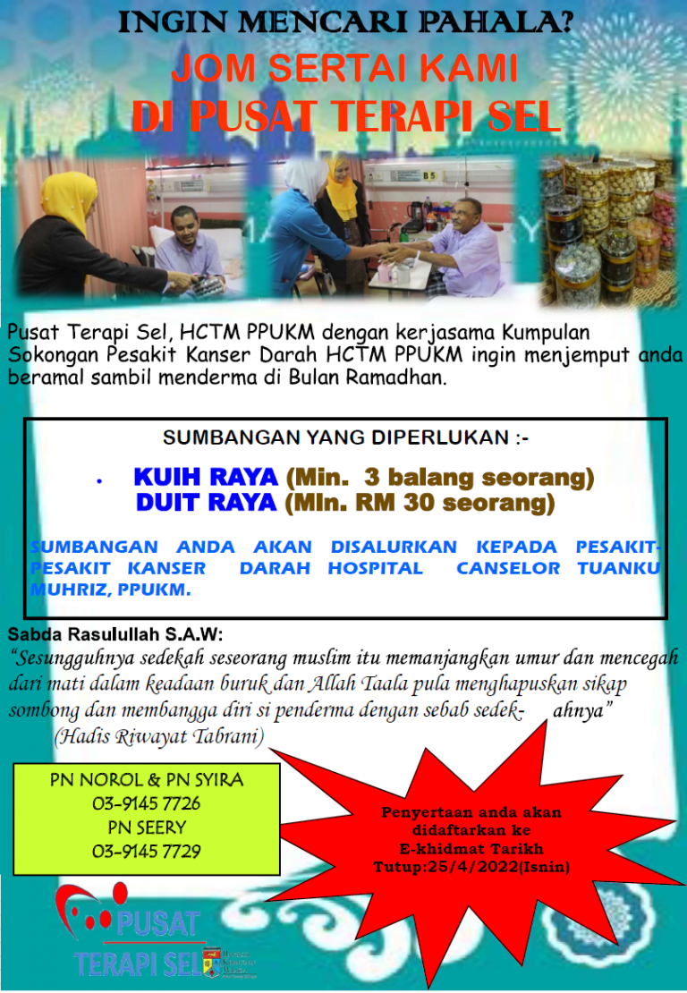 Pusat Terapi Sel, HCTM akan mengadakan Program Sumbangan Kuih Raya atau Duit Raya untuk pesakit Kanser Darah di HCTM. Sumbangan...