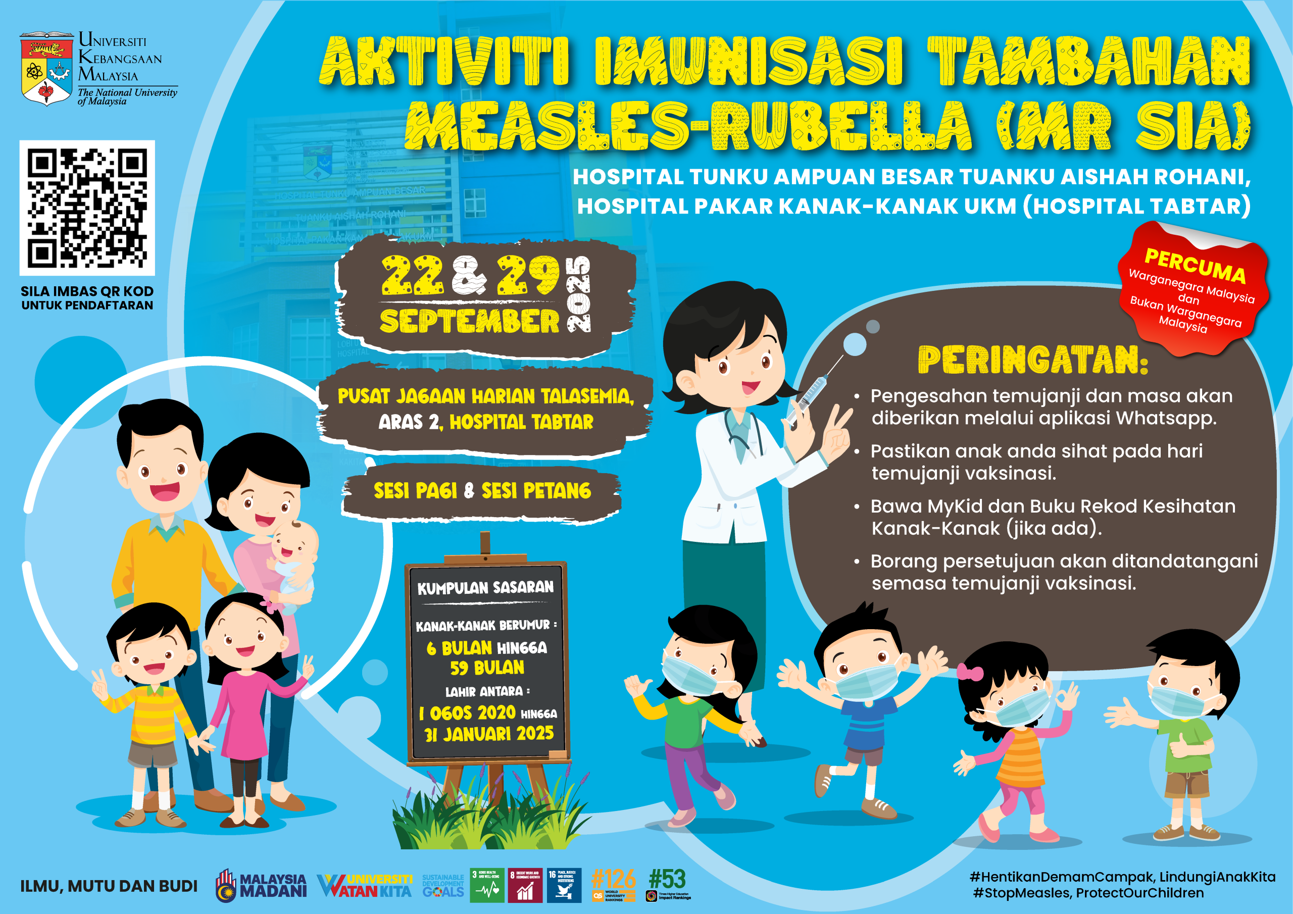 • 22 September 2025 (Isnin) – Pusat Jagaan Harian Talasemia, Aras 2, Hospital Tunku Ampuan Besar Tuanku Aishah Rohani, Hospital Pakar Kanak-Kanak UKM (Hospital TABTAR)