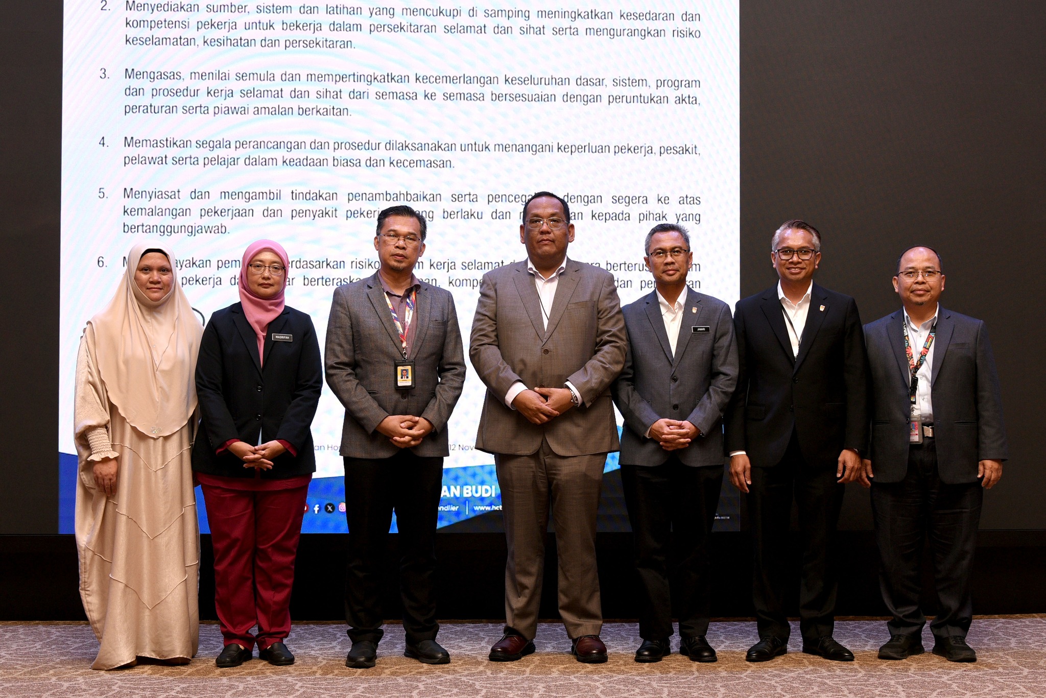 Pengisian program ini telah disampaikan oleh Ts. Baderin Osman, Pakar Teknikal (III) dan Puan Haalah Mahmud, Pegawai Teknikal dari National Institute of Occupational Safety and Health (NIOSH). Program sehari ini telah berlansung dengan jayanya dengan penyertaan seramai kira-kira 70 orang kakitangan HCTM.