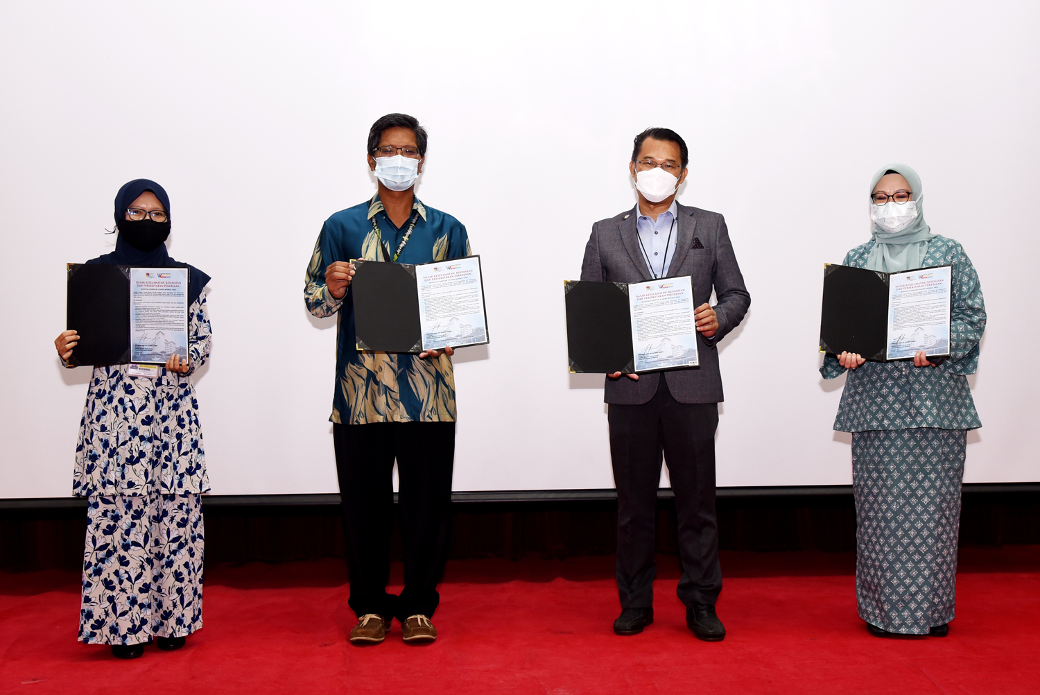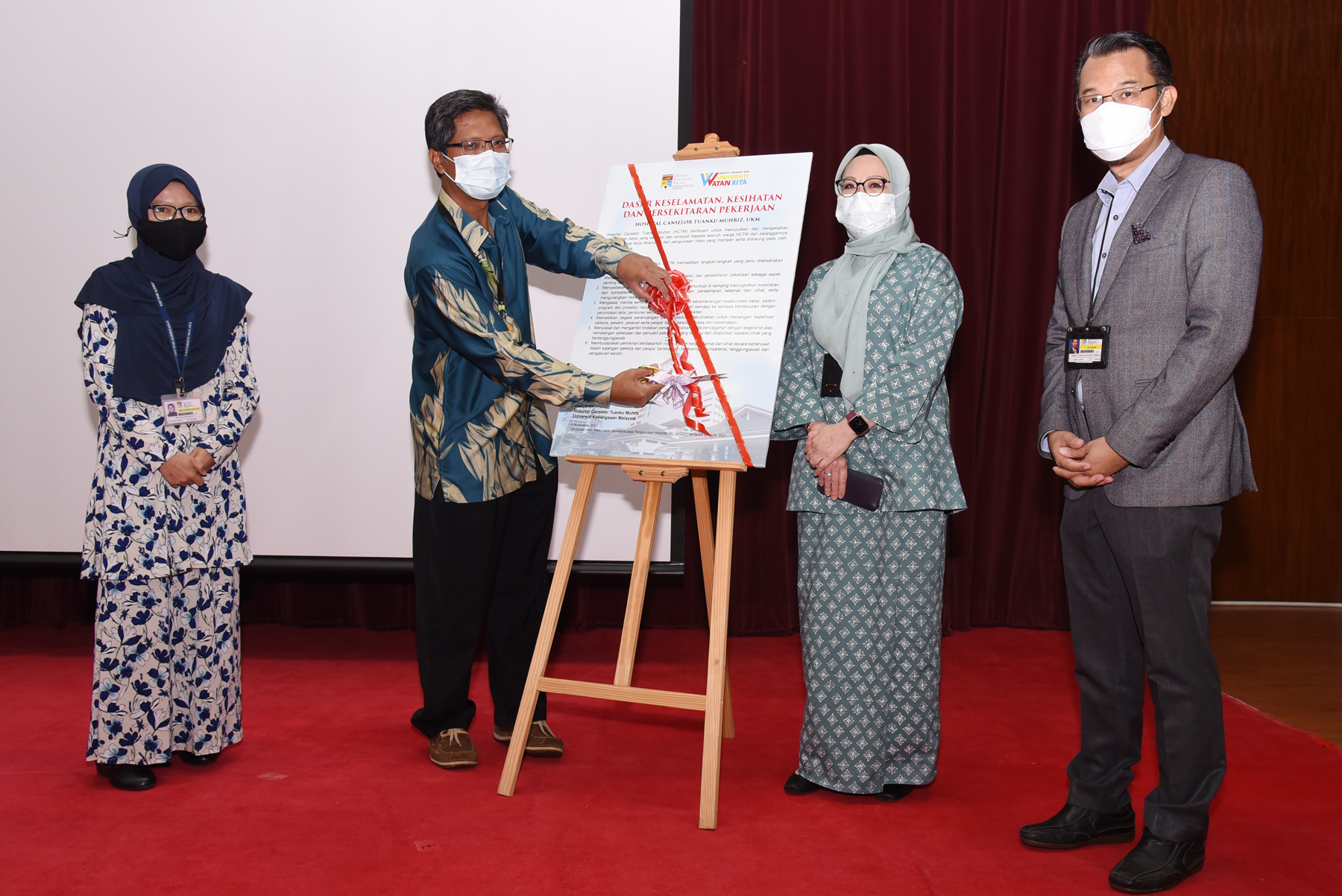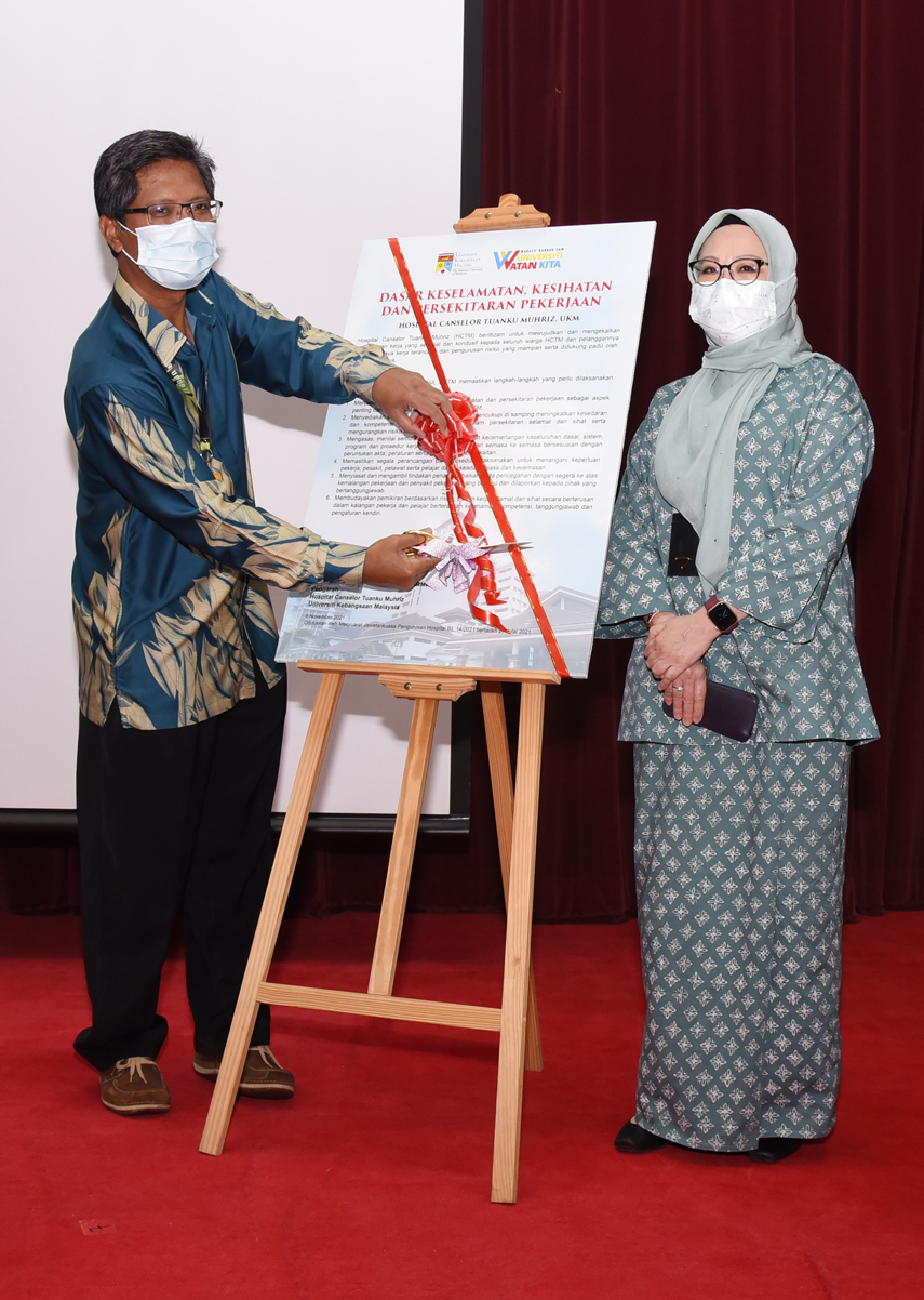 Dasar Keselamatan, Kesihatan dan Persekitaran Pekerjaan yang pertama telah dilancarkan dalam Perhimpunan Kakitangan HCTM Bil.4/2021 semalam. Sebaik sahaja YBhg. Prof. Dato’ Dr. Razman Jarmin, Pengarah HCTM selesai memberikan ucapan, acara memotong riben dan menurunkan tanda tangan Pengarah pada papan dasar yang dijalankan sebagai simbolik pelancaran. Mengiringi pelancaran ini Prof. Madya Dr. Hanita Othman, Timbalan Pengarah (Perkhidmatan Diagnostik, Farmasi Dan Sokongan), Encik Mursidi Ahamad, Timbalan Pendaftar, dan Dr. Nurmasitah Mohamad Nazri, wakil Ketua Keselamatan dan Kesihatan Pekerjaan. Dasar Keselamatan, Kesihatan dan Persekitaran Pekerjaan dibangunkan oleh Unit Keselamatan dan Kesihatan Pekerjaan HCTM, selaras dengan keperluan Malaysian Society for Quality in Health (MSQH). Setiap jabatan perlu memastikan dasar ini dibaca dan dipamerkan di premis jabatan masing-masing. Warga HCTM boleh merujuk dasar ini pada pautan di bawah.