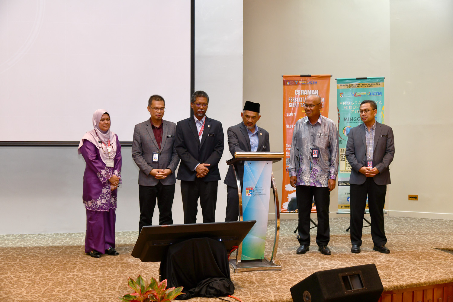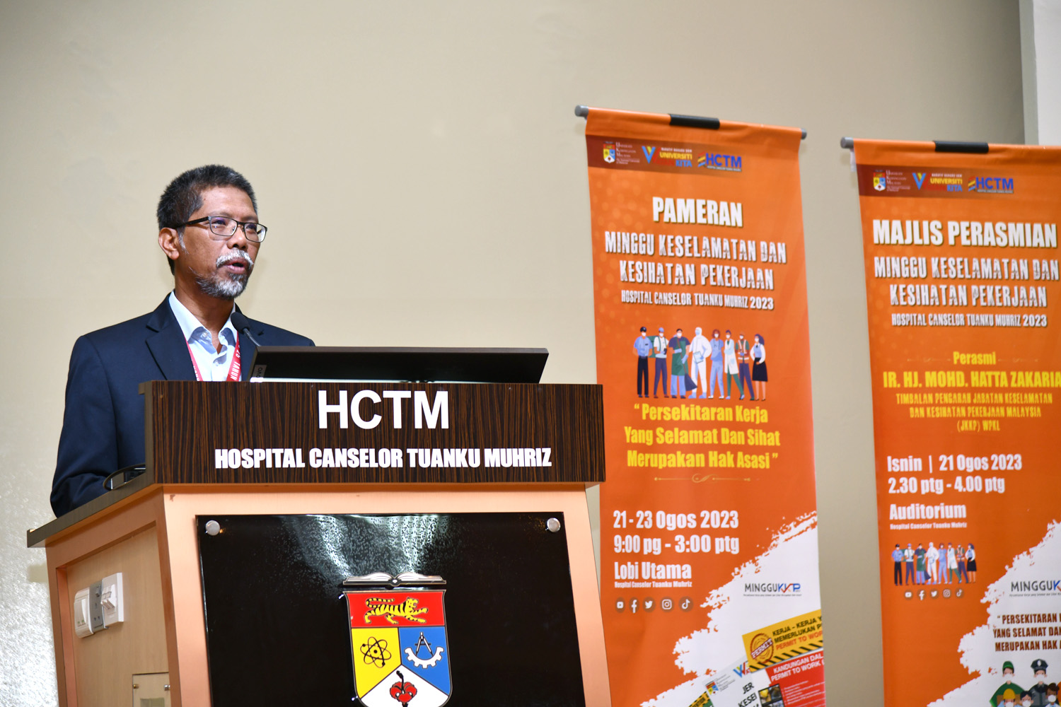 CHERAS, 21 Ogos – Persekitaran Kerja yang Selamat dan Sihat Merupakan Hak Asasi dipilih sebagai tema bagi sambutan Minggu Keselamatan dan Kesihatan Pekerjaan Hospital Canselor Tuanku Muhriz 2023. Majlis perasmian telah dirasmikan oleh Ir. Hj. Mohd. Hatta Zakaria, Timbalan Pengarah Jabatan Keselamatan dan Kesihatan Pekerjaan Malaysia (JKKP) WPKL. Majlis dimulakan dengan kata alu aluan daripada Pengarah Hospital Canselor Tuanku Muhriz, YBhg. Prof. Dato’ Dr. Razman Jarmin merangkap Pengerusi Jawatankuasa Keselamatan dan Persekitaran HCTM.