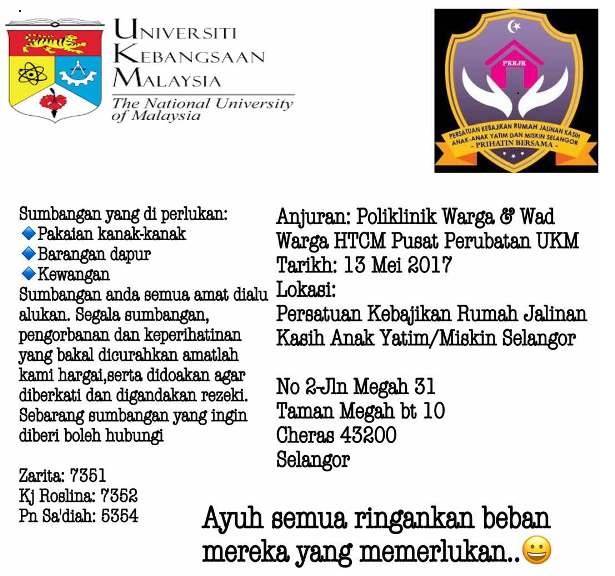 Program Khidmat Masyarakat anjuran Poliklinik Warga dan Wad Warga HCTM telah diadakan pada 13 Mei 2017 di Persatuan Kebajikan Rumah Jalinan Kasihg Anak Yatim/Miskin Selangor.