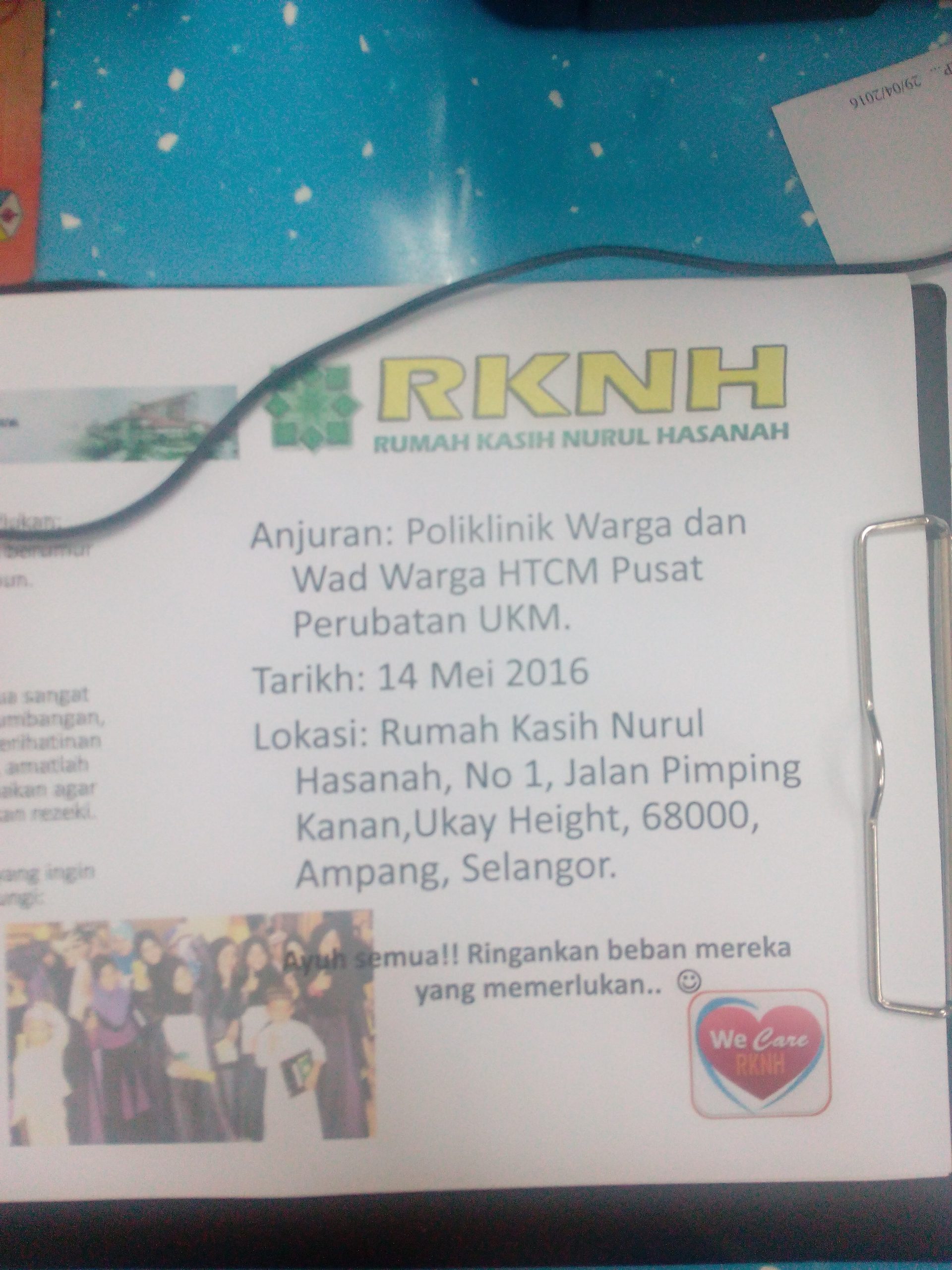 Program Khidmat Masyarakat anjuran Poliklinik Warga dan Wad Warga HCTM telah diadakan pada 14 Mei 2016 di Rumah Kasih Nurul Hasanah di Ukay Height, Ampang Selangor.